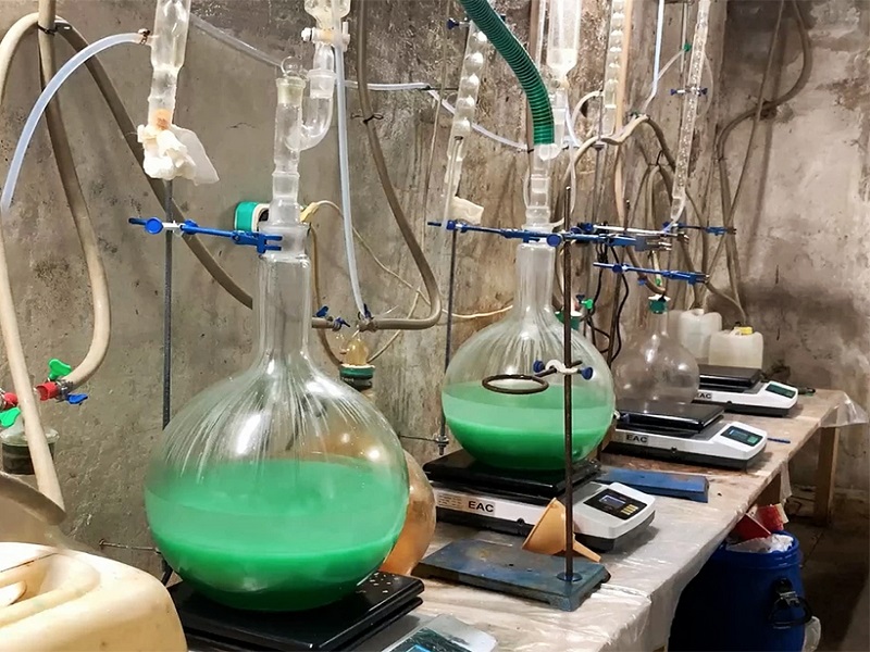 При обыске в доме подозреваемых было изъято 22 свертка с порошкообразным веществом (около 11 килограммов), емкости с химическими жидкостями, лабораторная посуда, весы, аппаратура для смешивания, средства индивидуальной защиты и другое.