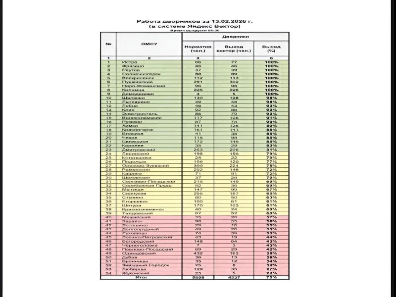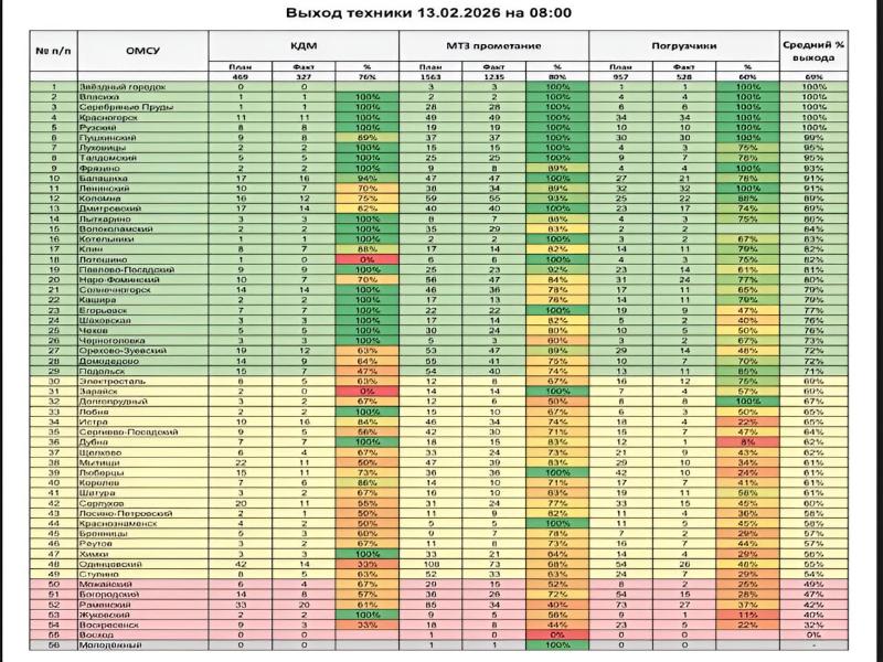 Анализ данных по выходу техники на 13 февраля показывает, что в среднем по региону процент выхода спецтехники составил 69%. Однако, в некоторых районах этот показатель значительно ниже: в Одинцовском районе – 33%, Раменском – 42%, Воскресенске – 32%. В Звёздном городке, Власихе и Серебряных Прудах техника вышла в полном объеме.
