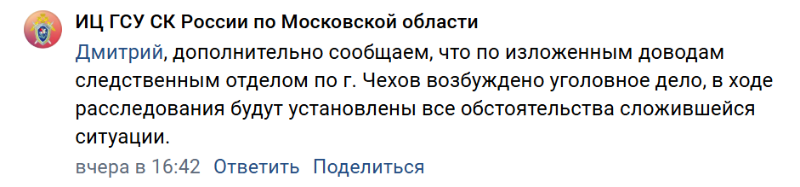 «По изложенным доводам следственным отделом по г. Чехов возбуждено уголовное дело, в ходе расследования будут установлены все обстоятельства сложившейся ситуации».