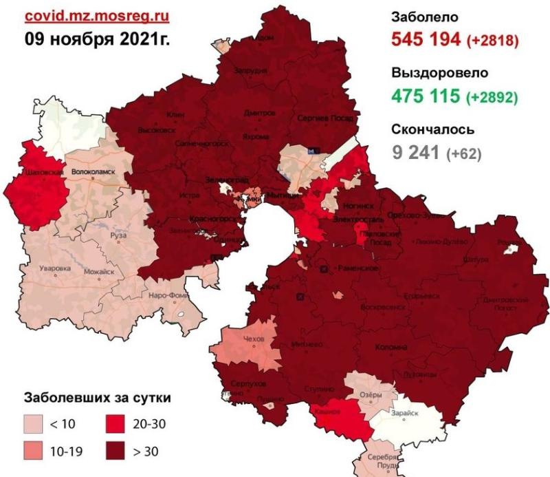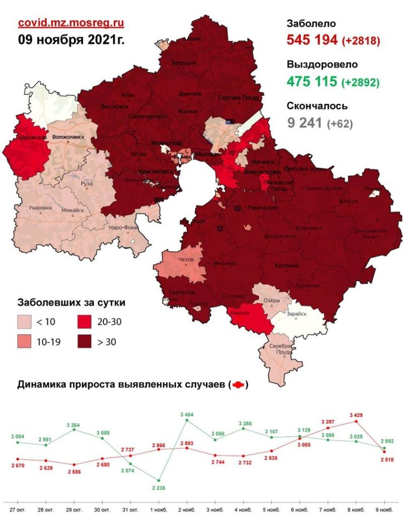 Всего на данный момент в Московской области выявлено 545 194 случая заболевания коронавирусной инфекцией. Скончался 9 241 человек. Выздоровели и выписались 475 115 человек.