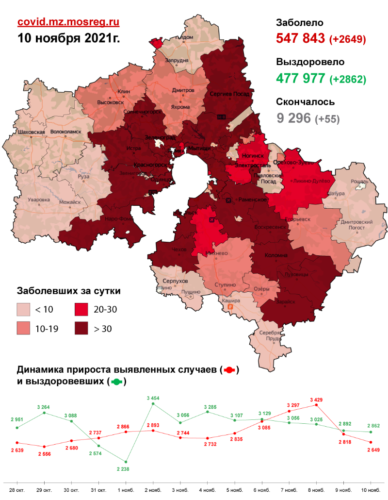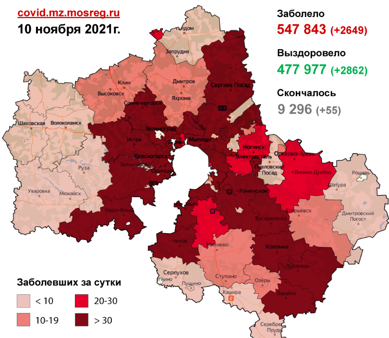 Всего на данный момент в Московской области выявлено 547 843 случая заболевания коронавирусной инфекцией. Скончались 9 296 человек. Выздоровели и выписались 477 977 человек.
