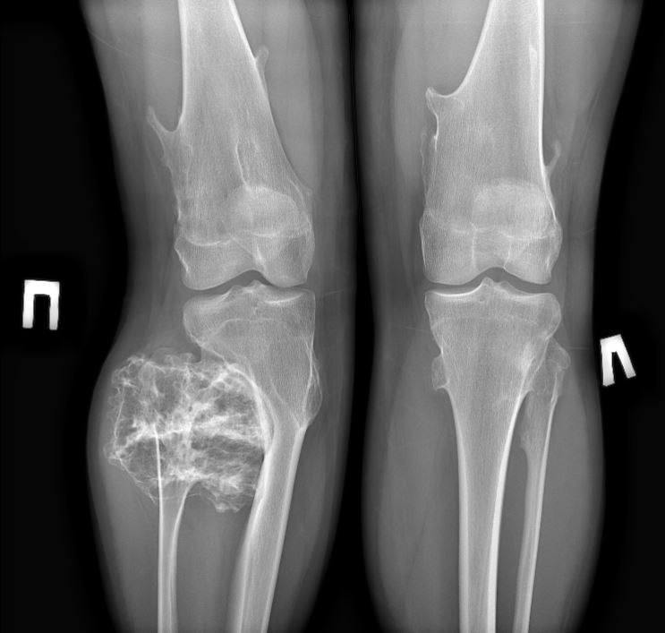 В областную детскую больницу обратился юноша, обнаруживший у себя в голени необычное уплотнение. После проведения осмотра и исследований врачи диагностировали большую остеохондрому – доброкачественное костное образование, покрытое хрящом. Новообразование достигало внушительных размеров – 9 на 8 на 8 сантиметров.