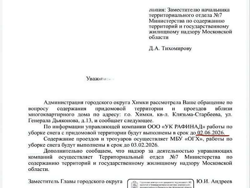Подмосковье, как всегда, не перестает удивлять. И на этот раз повод для удивления, а точнее, для легкого шока, прилетел из Химок. Местные жители теперь точно знают, когда их дворы будут очищены от снега. И это не шутка, не опечатка, а официальный ответ от управляющей компании «Рафинад»: до 2 июня!