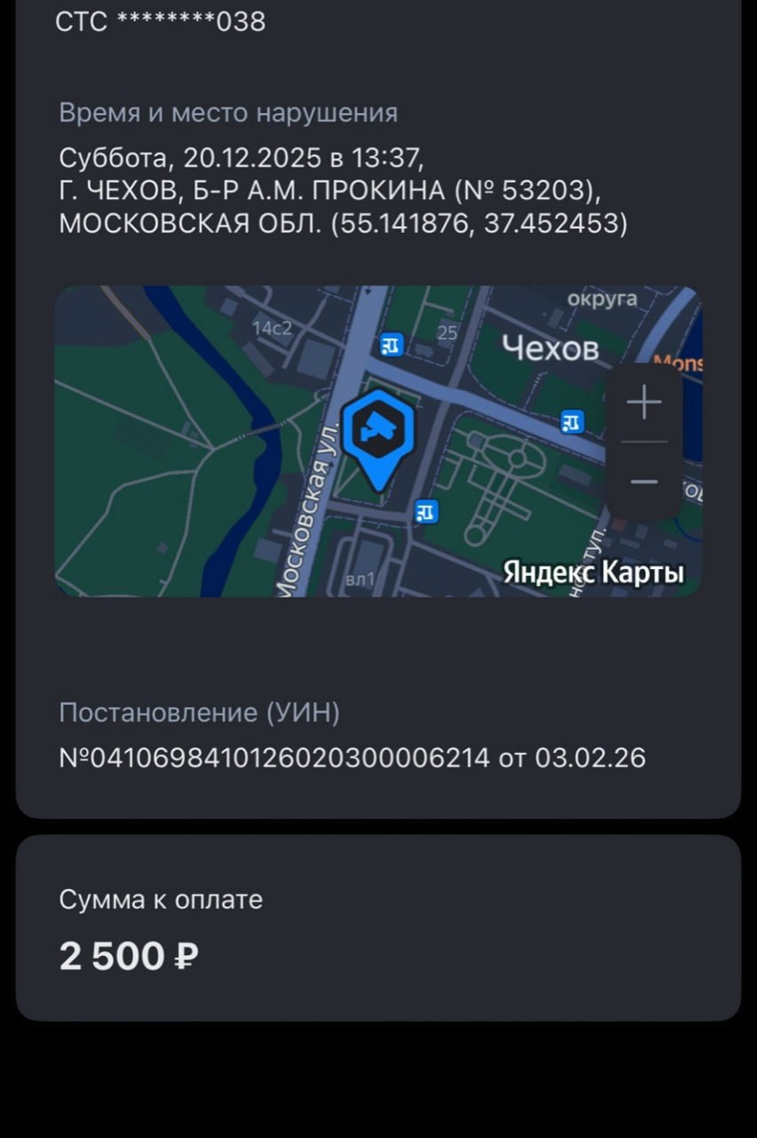 «А давно ли в Чехове на против танка платная стоянка? Пришел штраф 2500, ставила машину там 20 декабря, штраф пришел вчера. Просто помню, что там ставили все а сейчас вот оно как, и там я не видела платежный столбик».