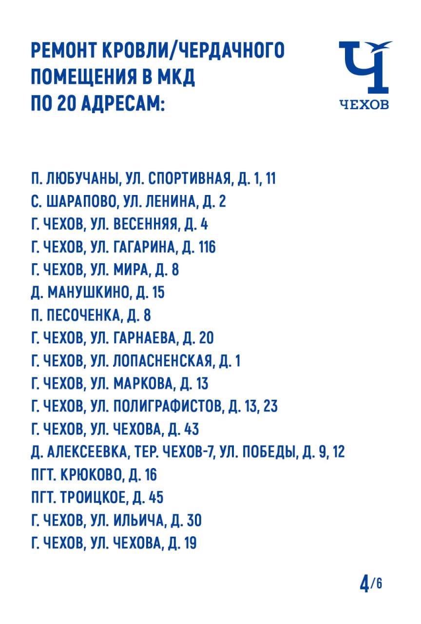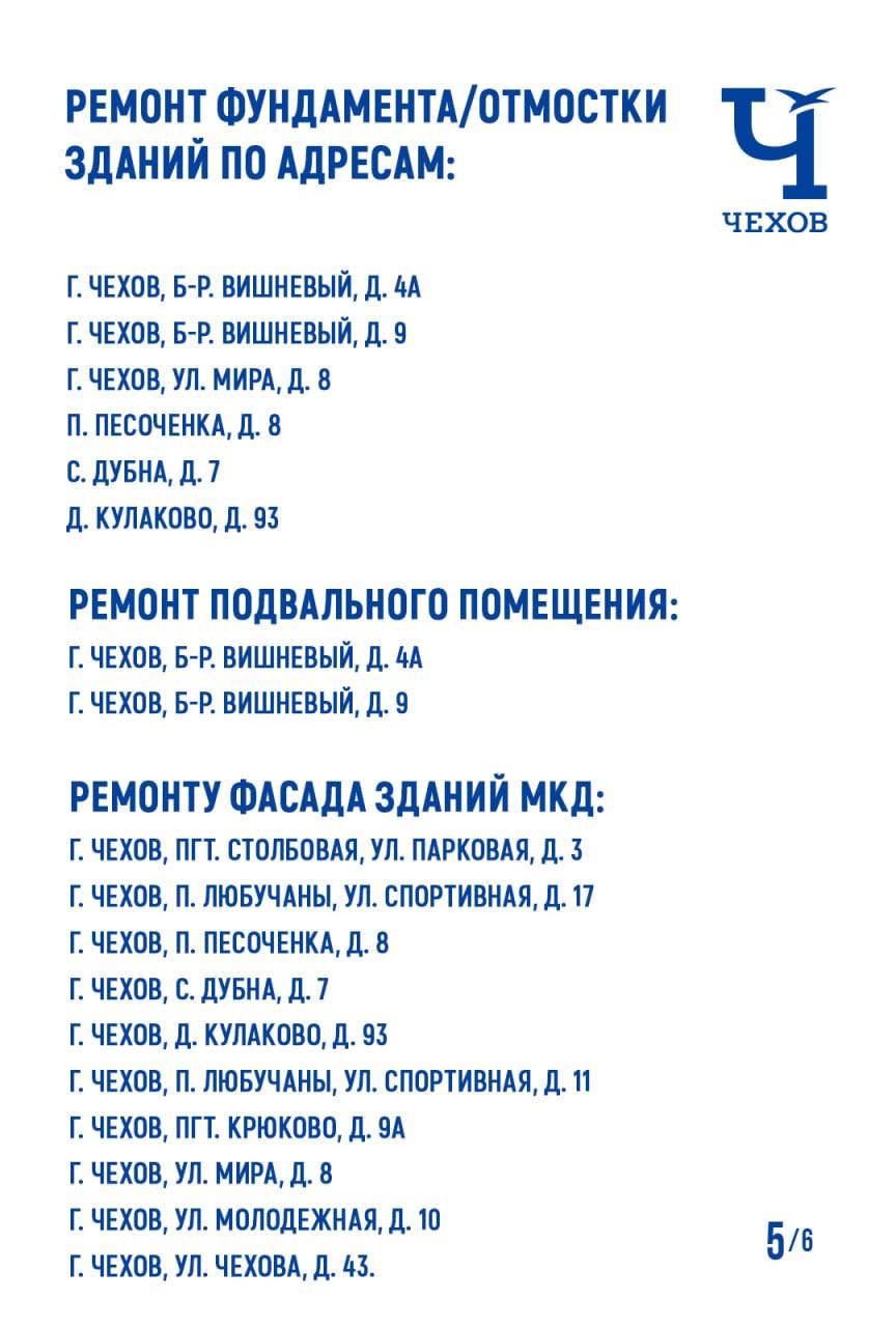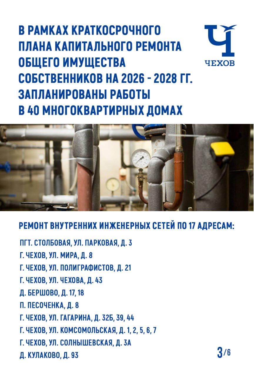 В муниципальном округе Чехов стартовала трехлетняя программа капремонта. Уже утвержден краткосрочный план на 2026-2028 годы, согласно которому запланированы работы в 40 многоквартирных домах (МКД). Ремонт внутренних инженерных сетей проведут по 17 адресам, кровли – по 20, фундамента/отмостки коснётся 6 домов, ремонт подвального помещения запланирован по двум адресам, а фасада – по 10.