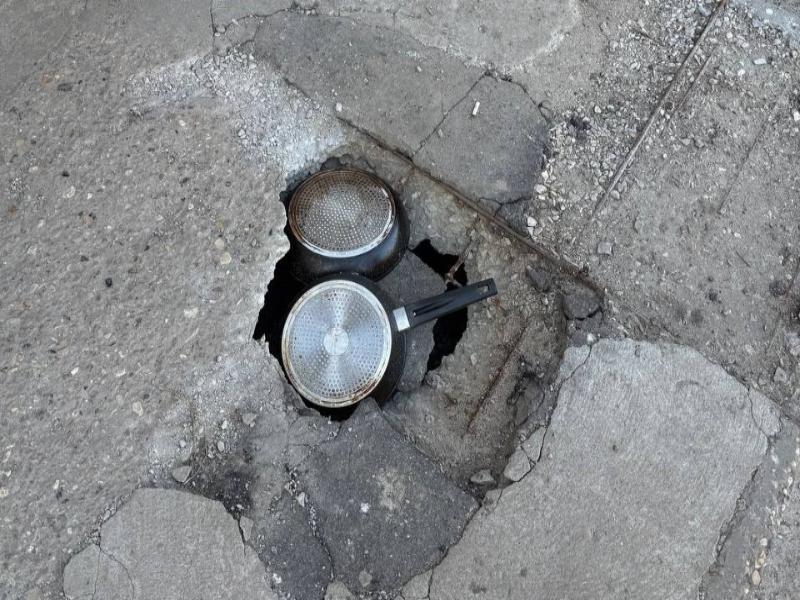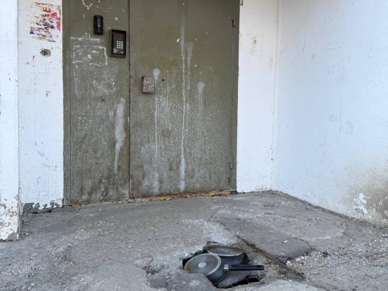 После бесчисленных и безрезультатных обращений в управляющую компанию, жильцы взяли ситуацию в свои руки. Для ремонта в ход пошли… сковородки, которые теперь служат «заплатками» для зияющих дыр в крыльце.