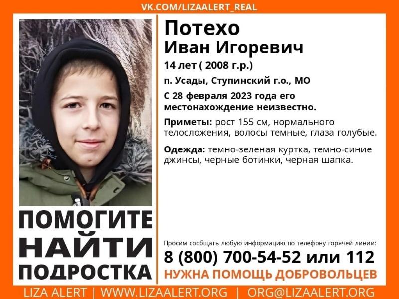 Потехо Иван Игоревич 2008 года рождения пропал в Ступинском округе Подмосковья, мальчика разыскивают близкие и добровольцы.