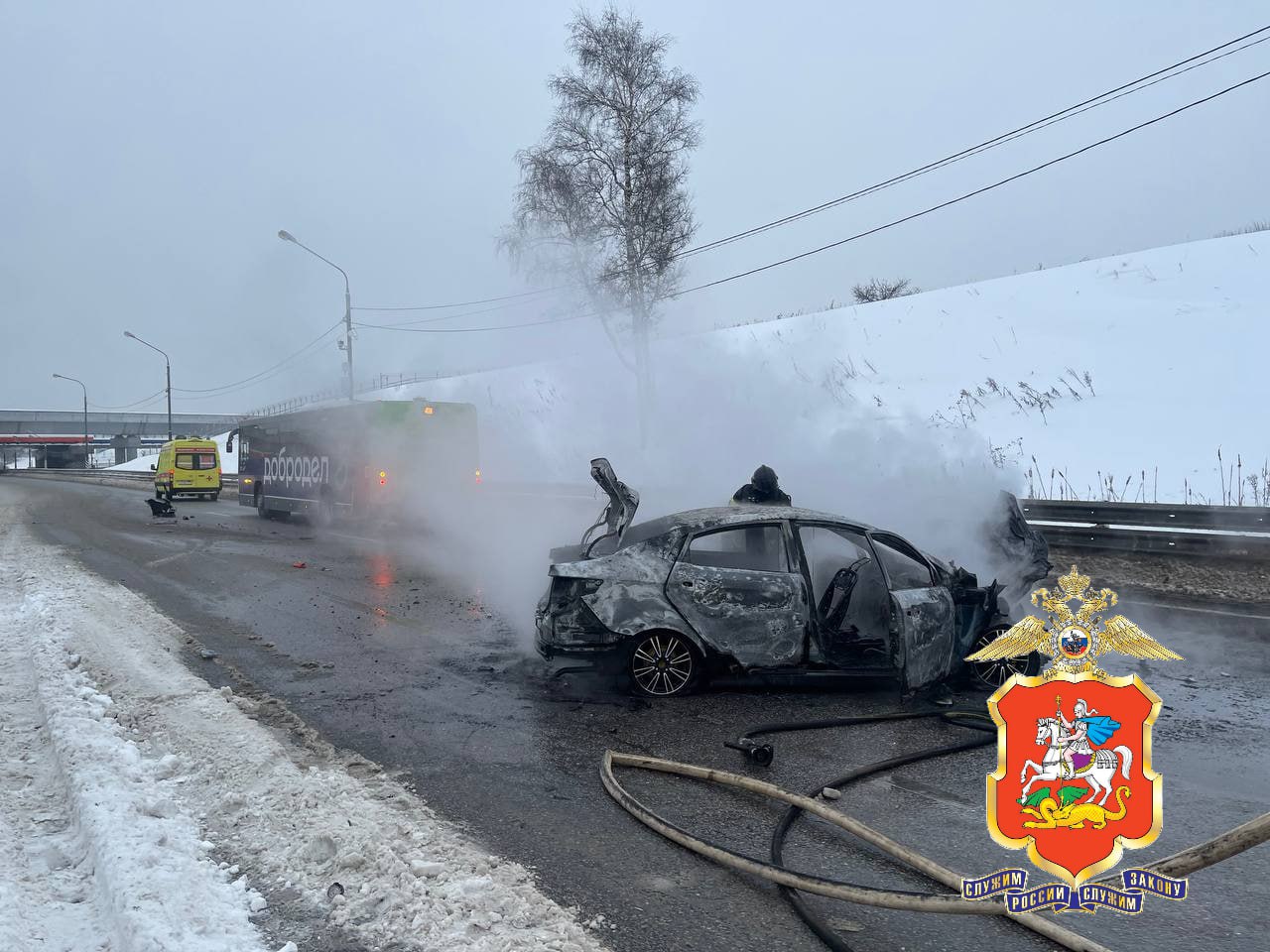 Утро в столичном регионе началось с серьезного ДТП в г.о. Химки. На Шереметьевском шоссе произошло столкновение легкового автомобиля «Киа» и автобуса «ЛиАЗ». Удар был такой силы, что легковушка загорелась.