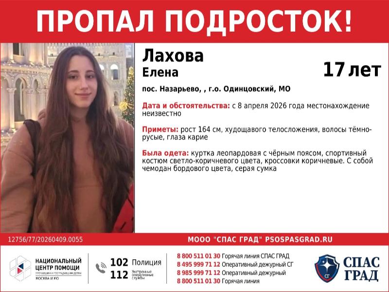 О начале поисков сообщил Национальный центр помощи пропавшим и пострадавшим детям. В Одинцовском городском округе, в поселке Назарьево, с 8 апреля разыскивается 17-летняя Лахова Елена. Девушка худощавого телосложения, ростом около 164 см, с темно-русыми волосами и карими глазами. На момент исчезновения она была одета в леопардовую куртку с черным поясом, светло-коричневый спортивный костюм и коричневые кроссовки. При себе у нее был бордовый чемодан и серая сумка.