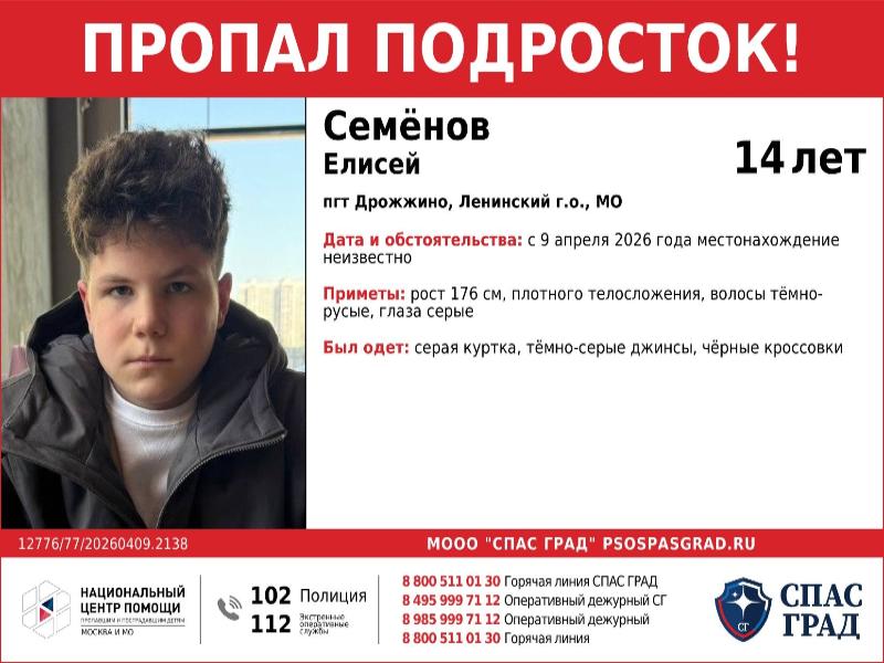 Параллельно в Ленинском городском округе, в поселке городского типа Дрожжино, с 9 апреля ищут 14-летнего Семёнова Елисея. Юноша имеет плотное телосложение, рост около 176 см, темно-русые волосы и серые глаза. Он был одет в серую куртку, темно-серые джинсы и черные кроссовки.