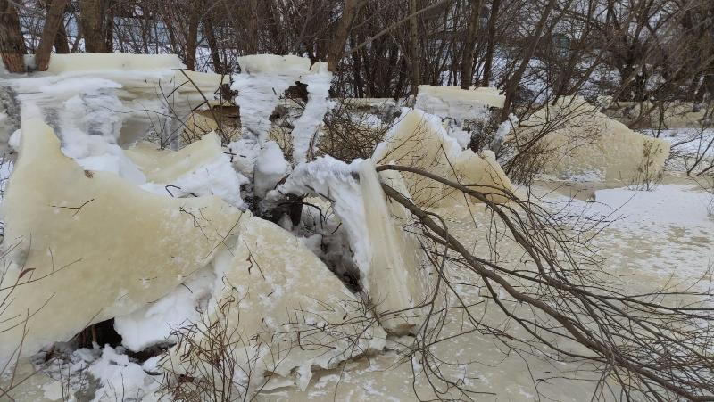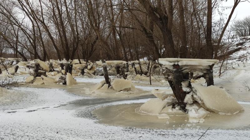 Как отмечают сведущие люди, во время существенных скачков температуры лёд в реке начал таять, уровень воды понизился. Поверхность водоёма оттаять не успела, и в буквальном смысле застряла на ветках кустов и деревьев, сформировав причудливые конструкции – «вертикальные льды».