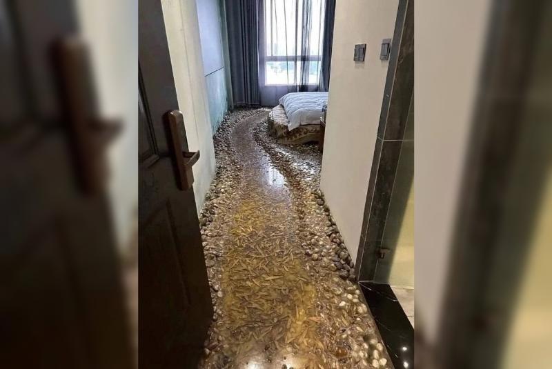 Житель Московской области затеял ремонт в квартире, пока жена и тёща отдыхали в санатории. Он залил поверхность эпоксидной смолой и создал имитацию речного русла, обрамлённого берегами.
