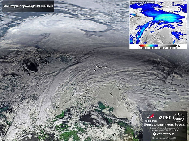 Как видно по снимкам, опубликованным госкорпорацией «Роскосмос» вихреобразное скопление густых белых облаков циклона «Фрэнсис» уже закрыли небо над столичным регионом.