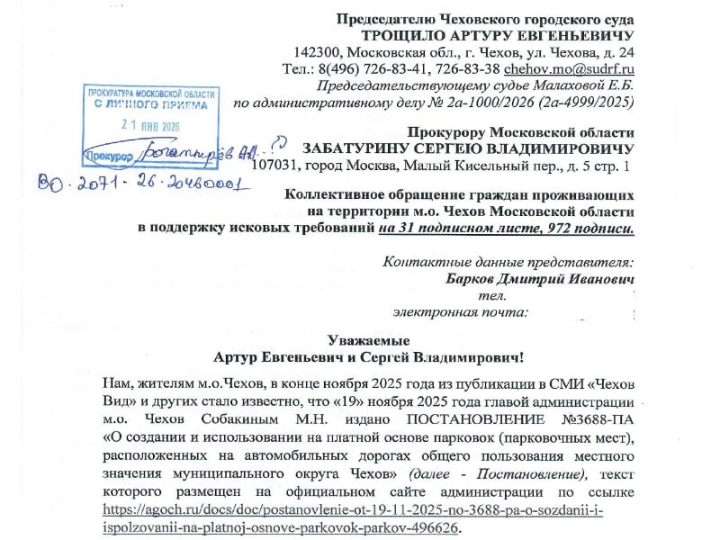 В муниципальном округе Чехов разгораются страсти вокруг платных парковок. Почти тысяча жителей округа (а точнее, 972 человека) обратились с коллективным заявлением к руководству Чеховского городского суда и областной прокуратуры. Причина недовольства – постановление о введении платных парковочных мест на улицах Дружбы и Первомайской.