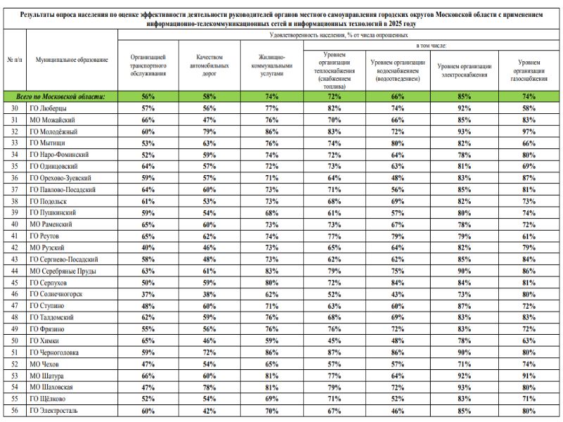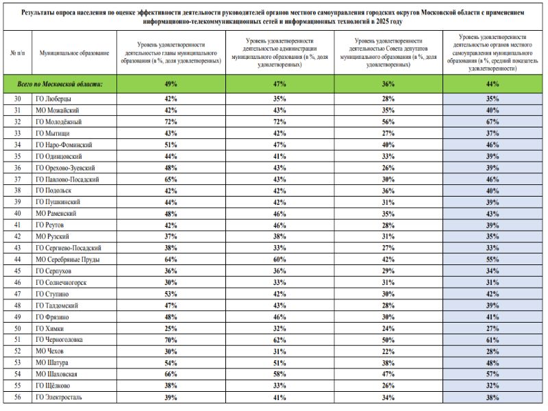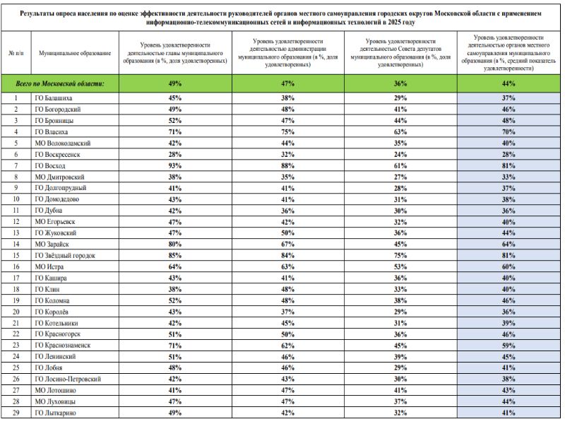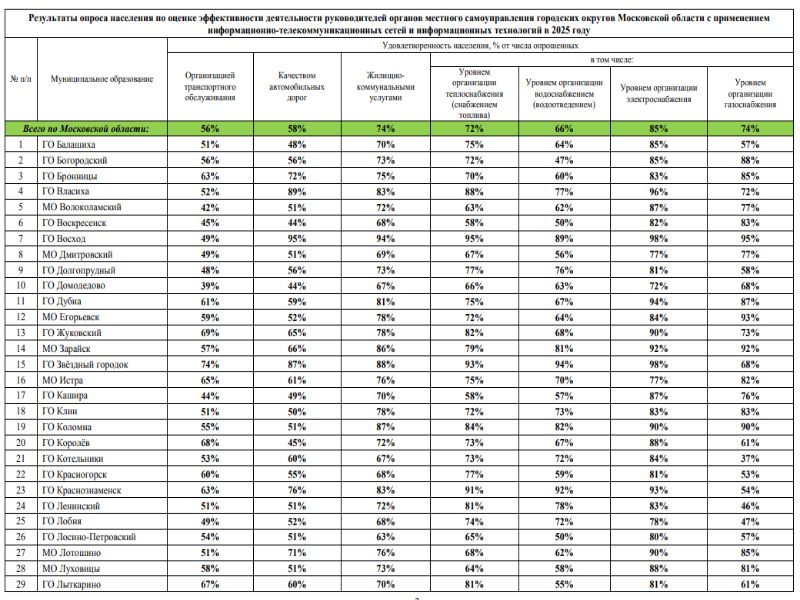 На официальном сайте правительства Московской области опубликованы данные, основанные на соцопросе населения. Он отражает уровень удовлетворенности работой органов местного самоуправления, включая глав муниципалитетов, администрации и советы депутатов.