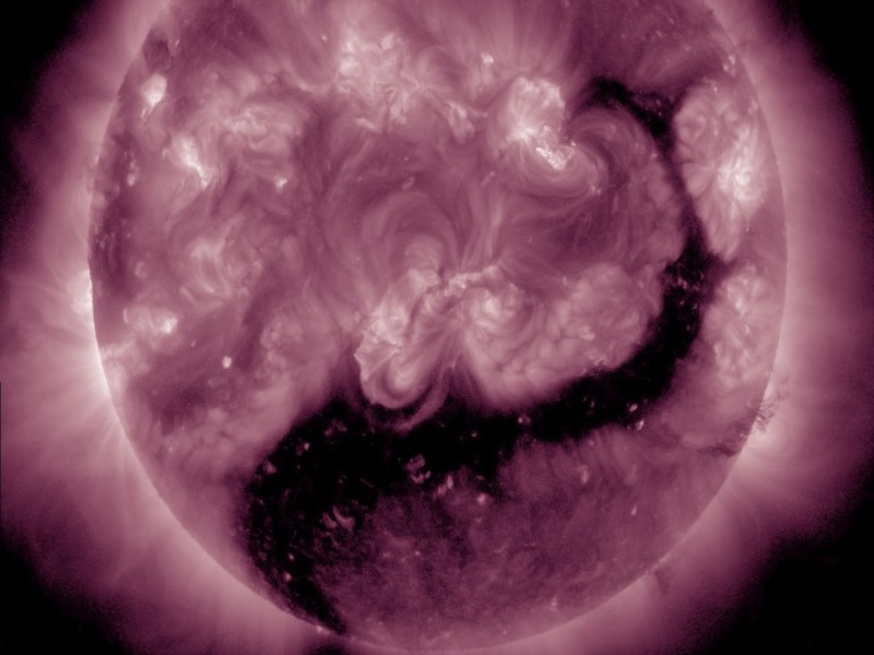 Лаборатория солнечной астрономии (XRAS) поделилась впечатляющим снимком Солнца. На этот раз на нем появилась гигантская корональная дыра, которая при определенном воображении напоминает огнедышащего дракона.