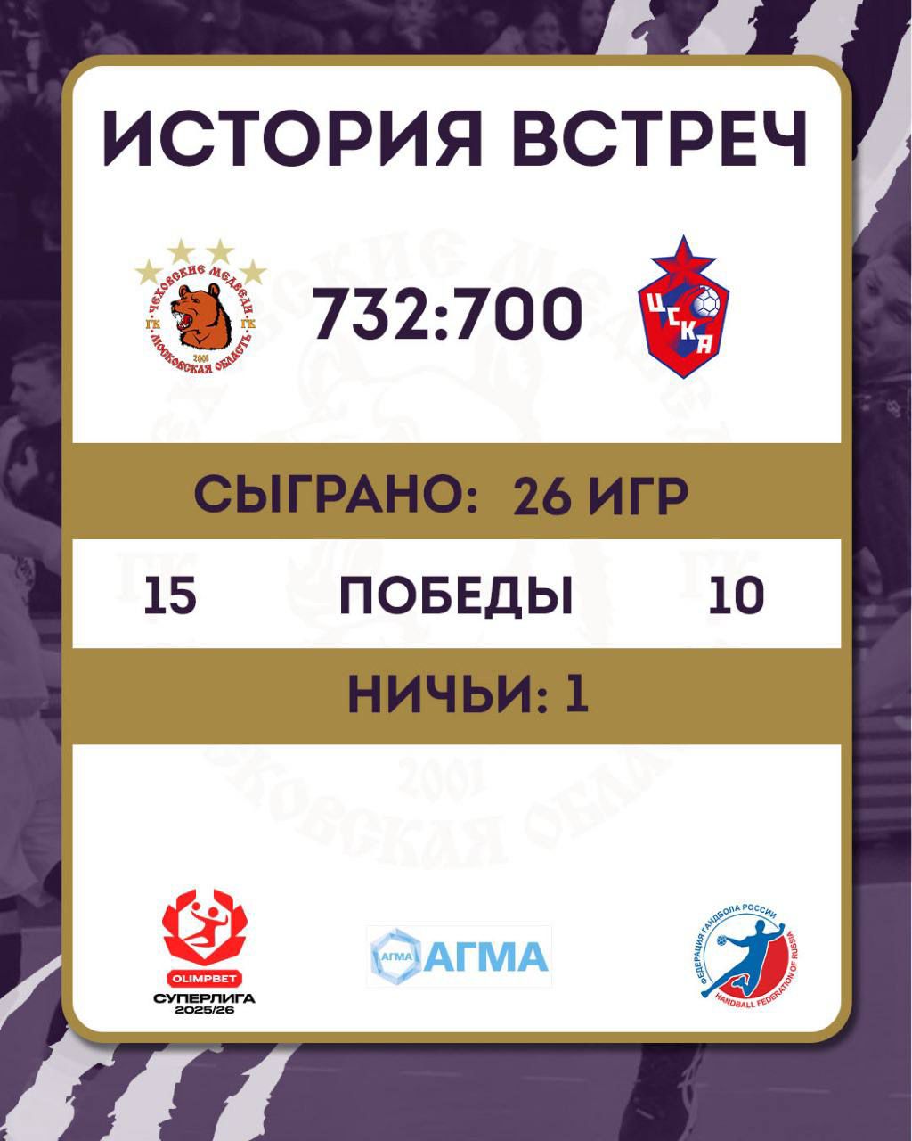 В прошлом сезоне команды встречались 5 раз: в чемпионате страны два раза в рамках регулярки и дважды в плей-офф. Один раз, в полуфинале, «медведи» и армейцы столкнулись в SEHA – Gazprom League «Дивизиона Восток». Счет во встречах сезона 2024/25 также на стороне Чехова: 2:1. Обе встречи предварительного этапа закончились победой «медведей». Ноябрьский матч в Чехове завершился со счетом 29:24, а мартовский в Москве – 23:26.