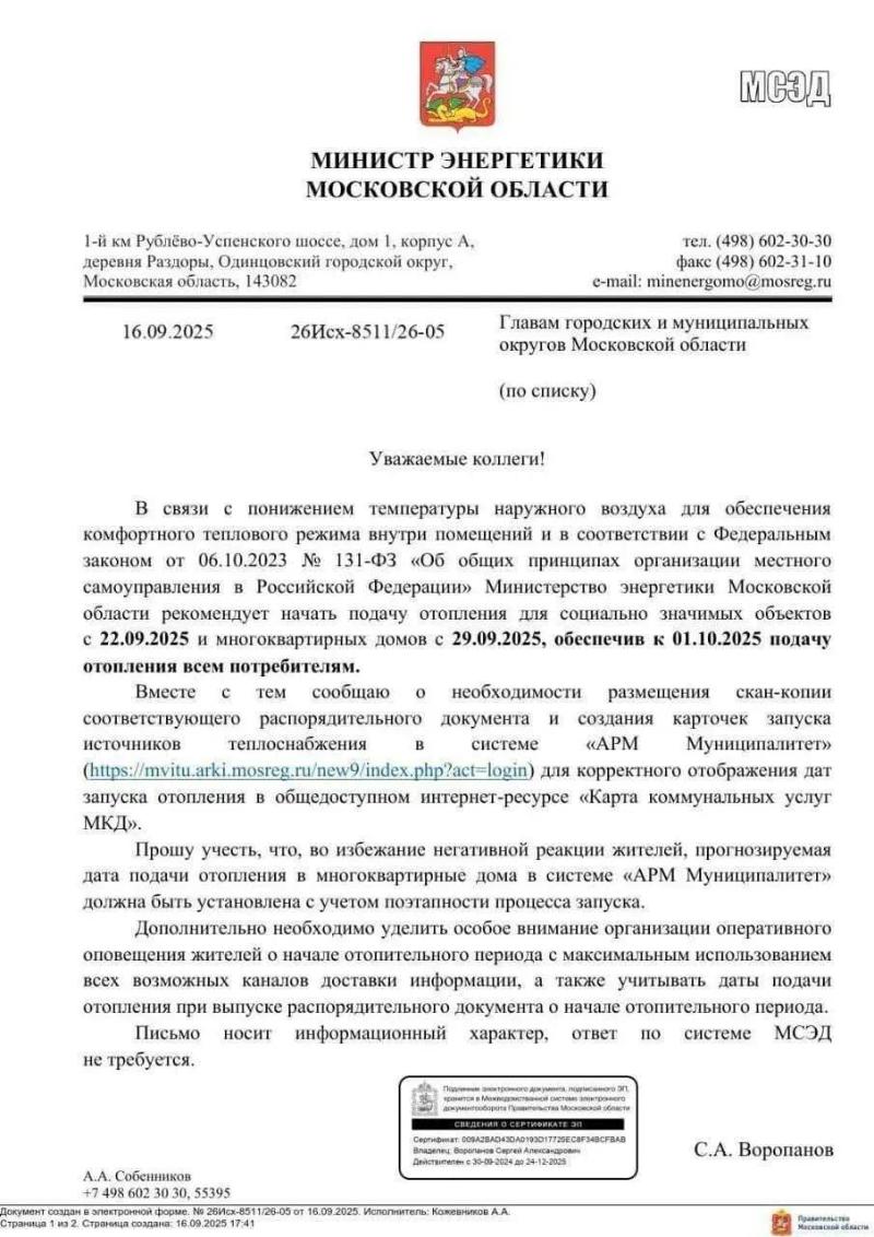 «В связи с понижением температуры наружного воздуха для обеспечения комфортного теплового режима внутри помещений… Министерство энергетики Московской области рекомендует начать подачу отопления для социально значимых объектов с 22.09.2025 и многоквартирных домов с 29.09.2025, обеспечив к 01.10.2025 подачу отопления всем потребителям», – говорится в документе.