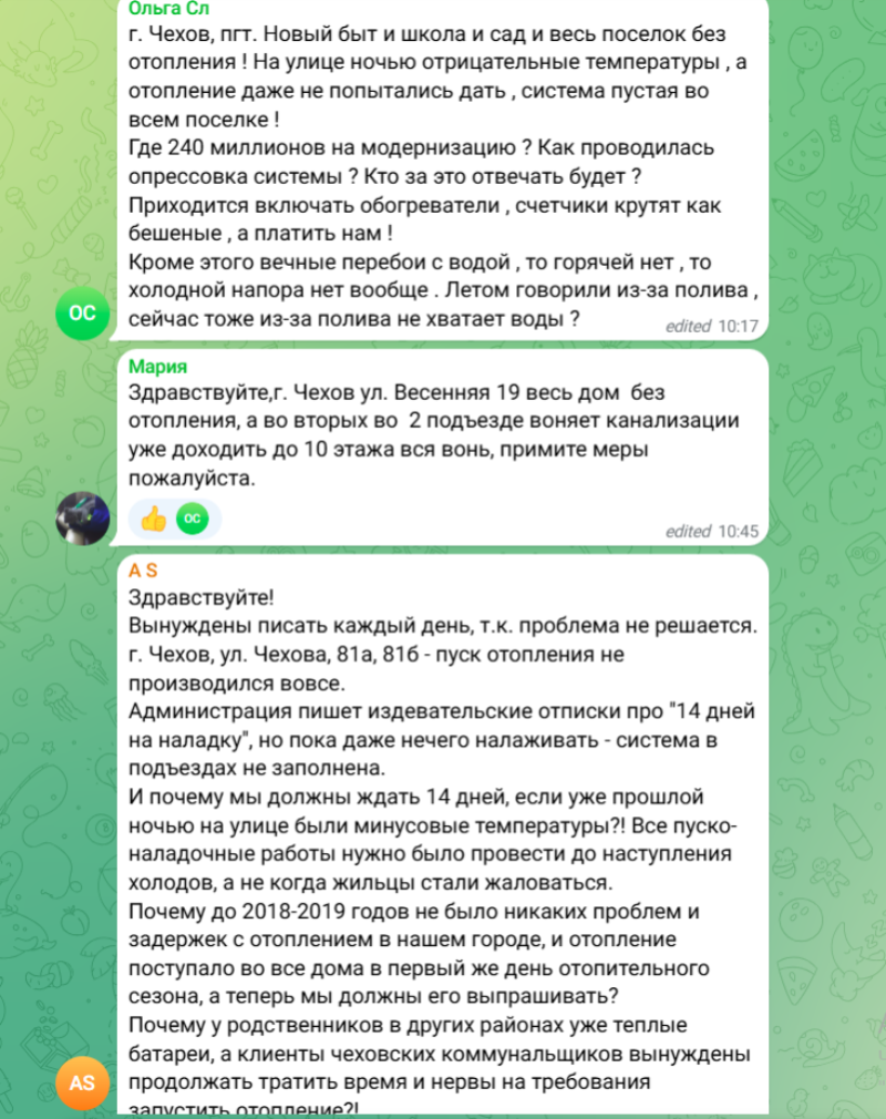 «Вынуждены писать каждый день, т.к. проблема не решается. г. Чехов, ул. Чехова, 81а, 81б - пуск отопления не производился вовсе. Администрация пишет издевательские отписки про "14 дней на наладку", но пока даже нечего налаживать - система в подъездах не заполнена. И почему мы должны ждать 14 дней, если уже прошлой ночью на улице были минусовые температуры?! Все пуско-наладочные работы нужно было провести до наступления холодов, а не когда жильцы стали жаловаться» - A S.