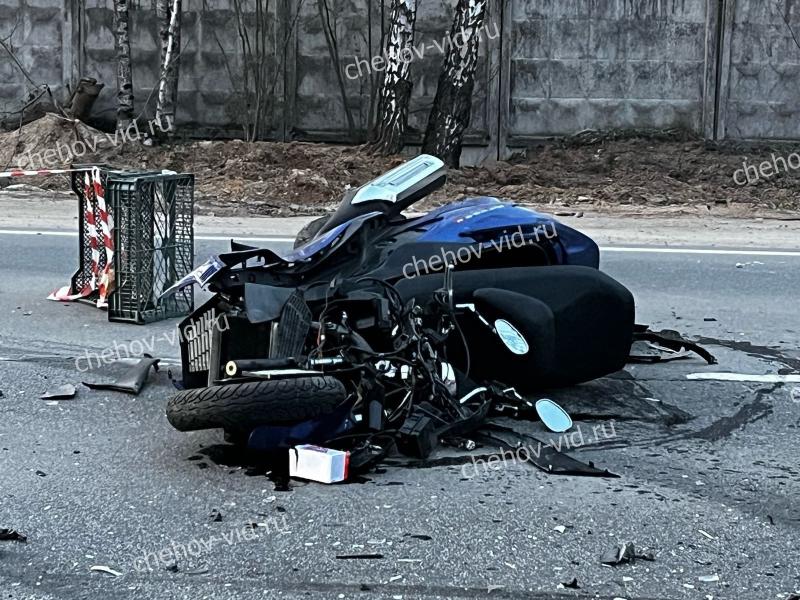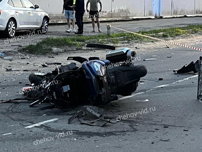 UPD: По свидетельствам очевидцев, за рулём «Шкоды», которая столкнулась с мотоциклом в Новосёлках (Чехов), мог находиться сотрудник полиции. Также в машине нашли открытую банку (предположительно) спиртного.