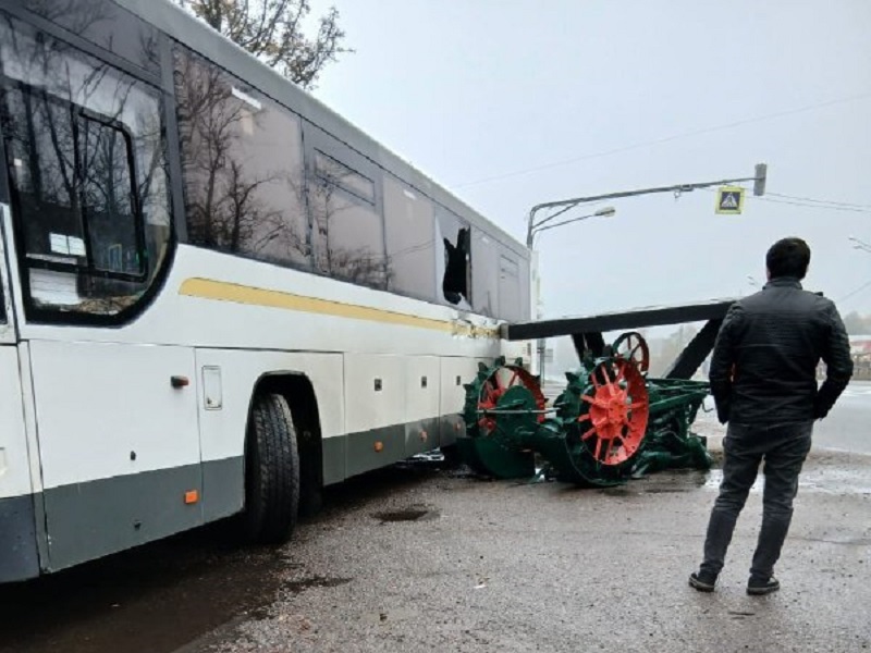 В подмосковных Бронницах произошла курьезная авария: пассажирский автобус «столкнулся» с памятником трактору.