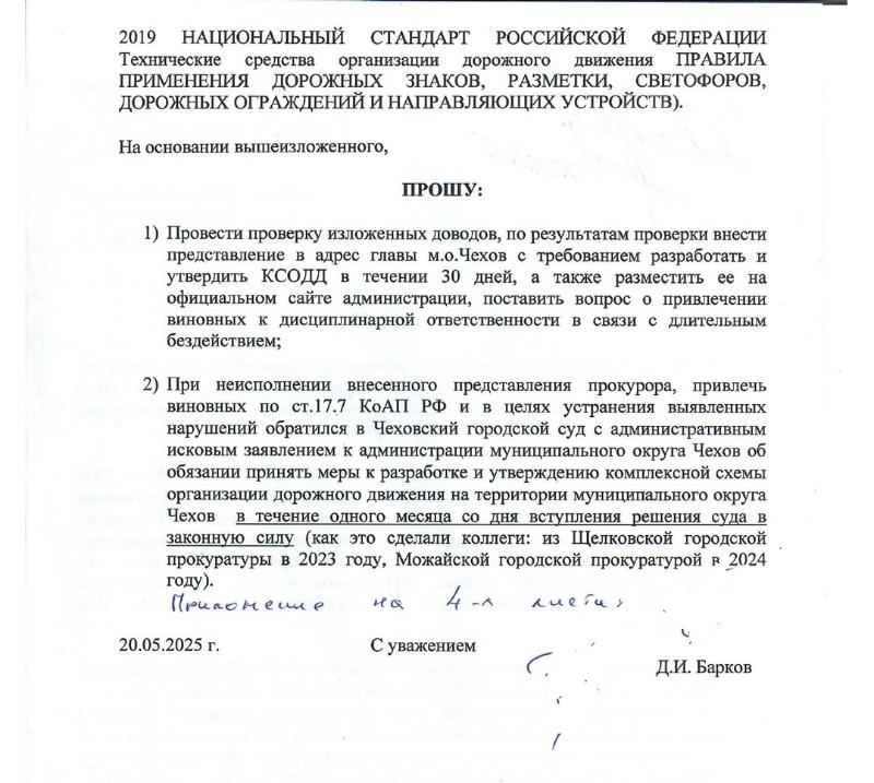 В своём обращении к прокурору Дмитрий Барков указывает, что комплексная схема организации движения должна быть разработана, утверждена местными чиновниками и быть размещена на официальном сайте администрации округа на основании 443 ФЗ. Но этого документа нигде нет.