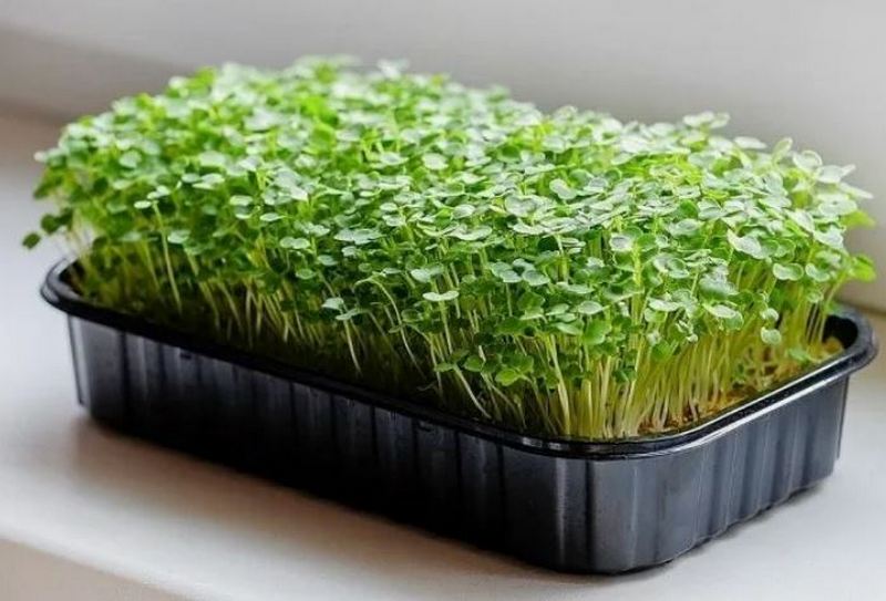 Перед посадкой кокосовый субстрат или льняные коврики замачиваются в воде и укладываются в лоток. Семена густо рассыпают по поверхности субстрата и увлажняют из пульверизатора.