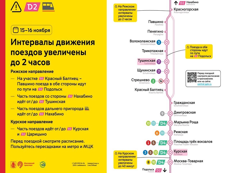 15 и 16 ноября на участке от Курской до станции Нахабино интервалы движения будут увеличены до 2-х часов.